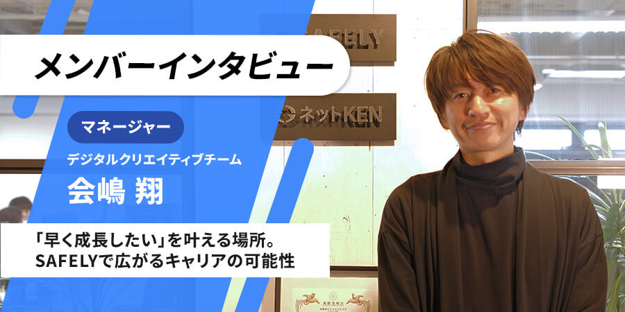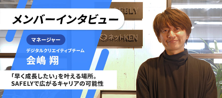 SAFELYで働くメンバーを紹介するインタビューシリーズ。今回はデジタルクリエイティブチームのマネージャーとして活躍する会嶋 翔さんに、自身のキャリアやSAFELYの魅力について語ってもらいました。